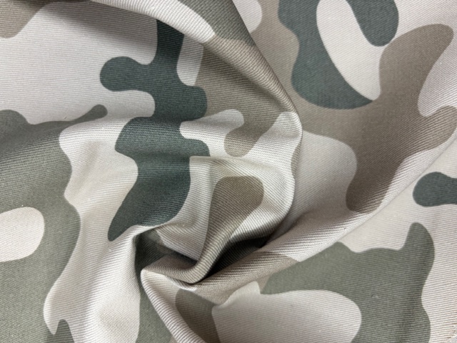 wytrzymała tkanina z nadrukiem kamuflażu pustynnego, łącząca funkcjonalność materiałów użytkowych z charakterystycznym wzornictwem inspirowanym naturalnym krajobrazem suchych, piaszczystych terenów. Wzór oparty jest na nieregularnych plamach w odcieniach beżu, piaskowego brązu, oliwki i przygaszonych szarości, które naśladują grę światła i cieni występującą na pustyni. Taki kamuflaż wizualnie rozprasza sylwetkę i nadaje tkaninie dynamiczny, outdoorowy charakter, jednocześnie doskonale wpisując się w aktualne trendy militarne i streetwearowe.