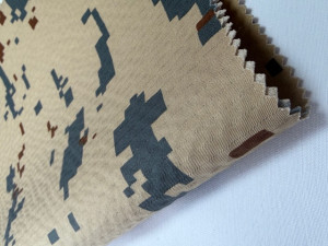 tkanina bawełniano-poliamidowa o gramaturze 220 g/m² z nadrukiem w cyfrowy kamuflaż pustynny inspirowany estońskim wzorem ESTDCU. Charakterystyczny, pikselowy układ plam w odcieniach piasku i beżu został zaprojektowany z myślą o skutecznym maskowaniu w środowisku suchym i półpustynnym.